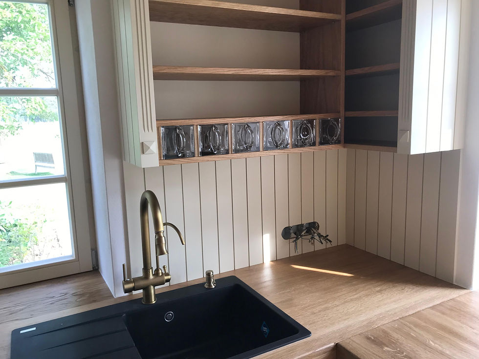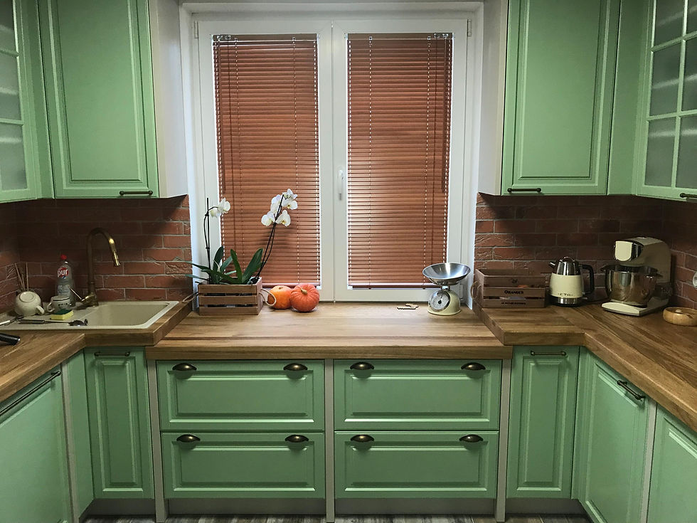 Provence zelená kuchyň, koupelna a dubové posuvné dveře
