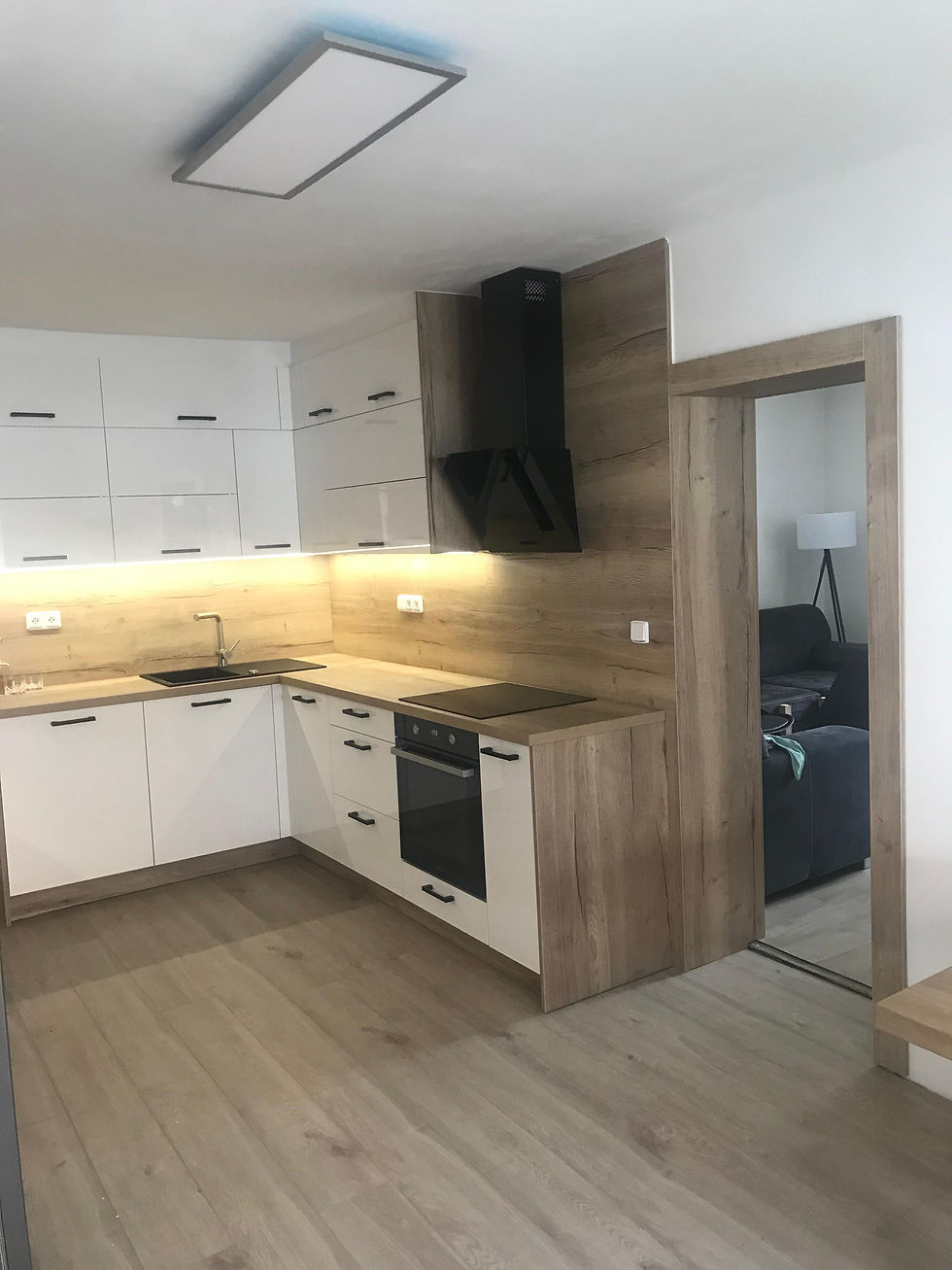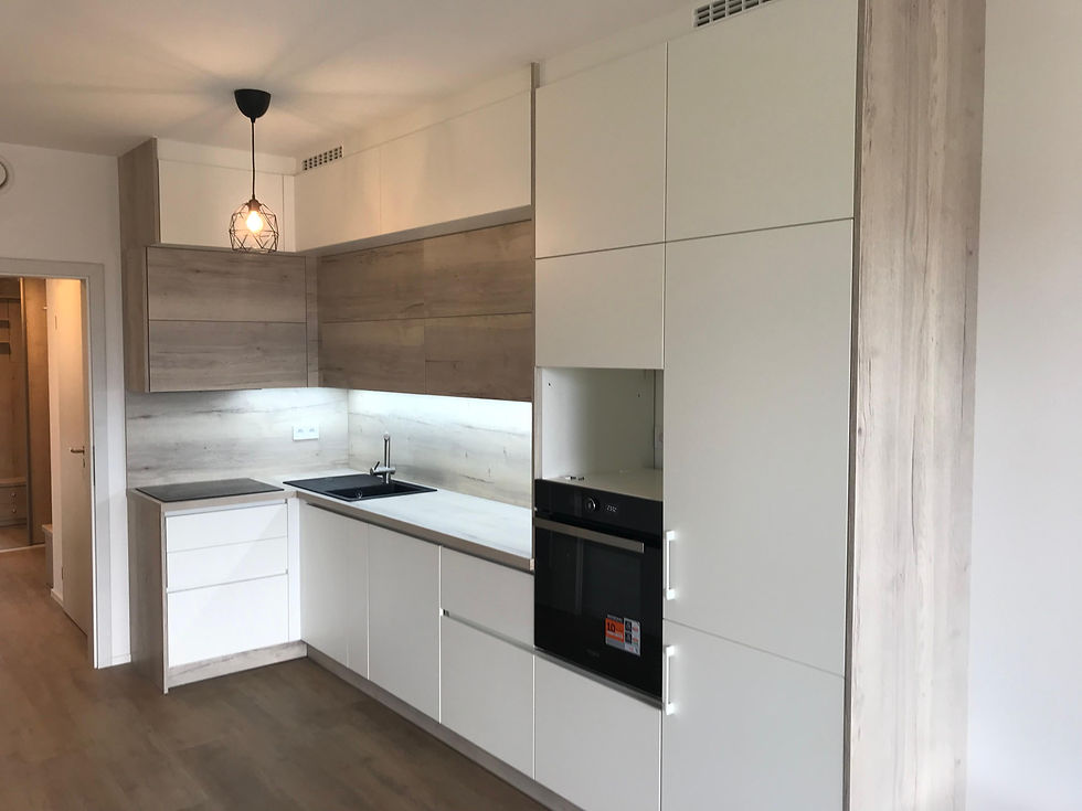 Bílá lesklá kuchyň v kombinaci s dubovým dezénem