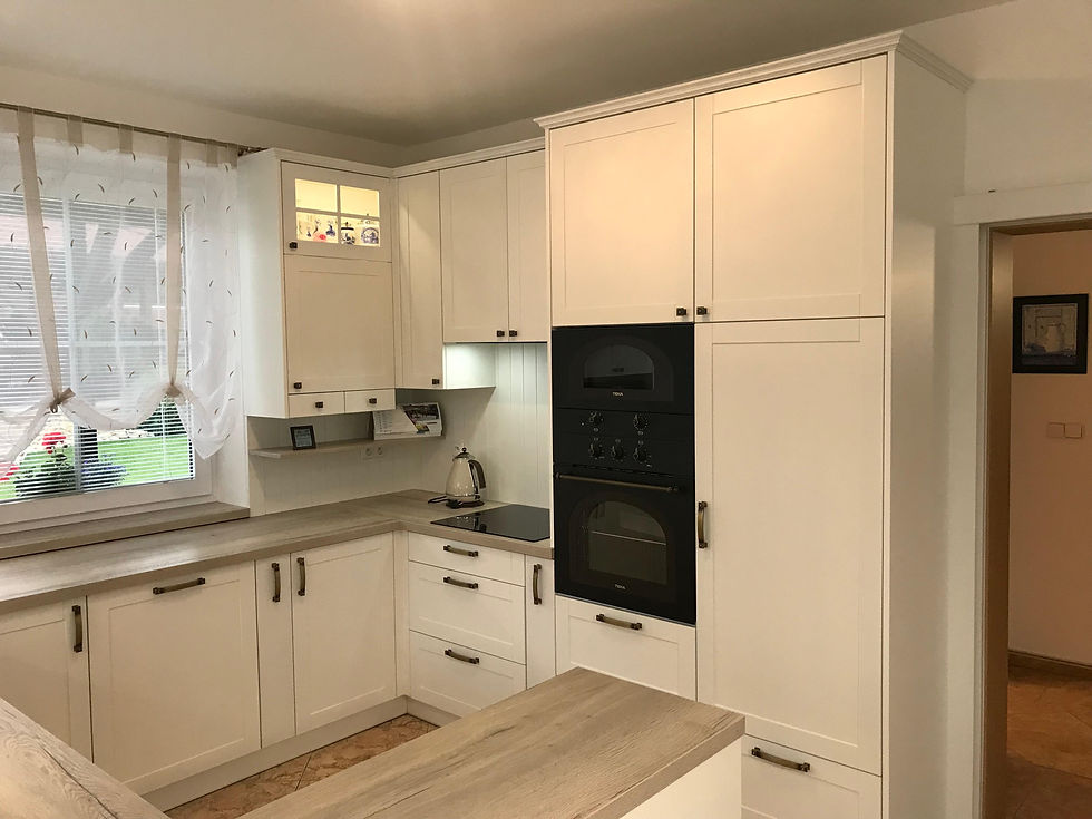 Provence kuchyň s ostrůvkem (krémová + dubový masiv)